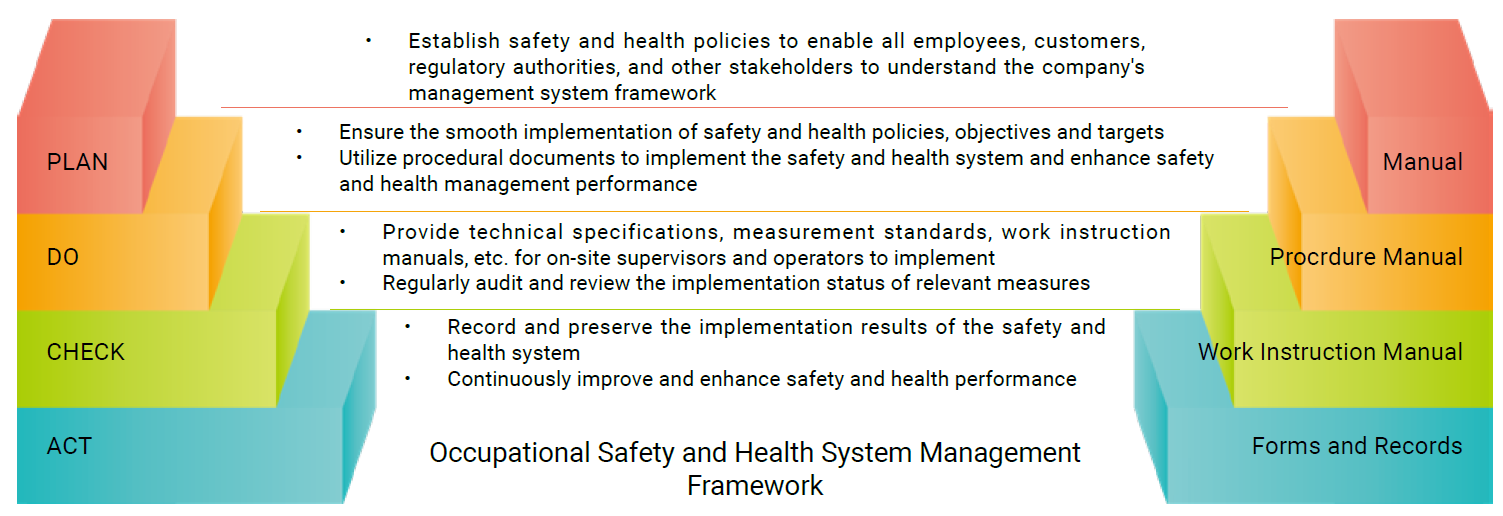 KYEC Group values all of our workers, and by promoting the TOSHMS standard (Taiwan Occupational Safety and Health Management System) and ISO 45001: 2018 Occupational Safety and Health Management System (the certificate is valid until November 25, 2026), it identifies all possible hazards that may occur within the factory. Risks are assessed, controlled, and continuously improved upon using the PDCA cycle concept. At present, the coverage rate of the KYEC Group’s occupational safety and health management system has reached 100%; through the operation of the management system, we are committed to creating a healthy and safe workplace environment for the KYEC Group and ensuring the health and safety of workers.