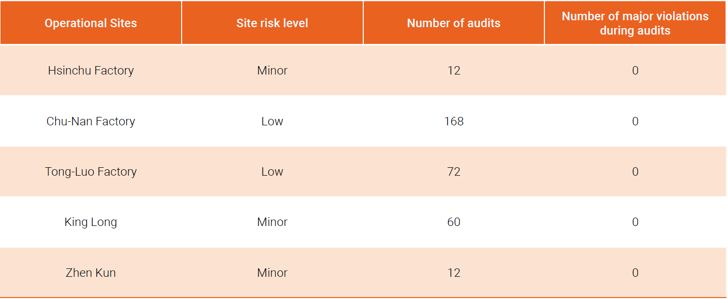 King Yuan Group follows local occupational safety and health regulations at each operational site to establish hazard identification and risk assessment procedures for the Occupational Safety and Health (OSH) management team under the OSH Committee to execute. The OSH management team annually conducts professional hazard identification and risk assessment training, Each year, the OSH management team reviews the workplace of each operational site and upstream and downstream suppliers, categorizing risks into five levels: severe, high, medium, low, and minimal based on factors including severity, likelihood of occurrence, and existing protective measures. The team assesses potential major occupational accidents or diseases and implements risk-mitigation control measures for risks at each level, with regular audits to ensure the effectiveness of these measures.