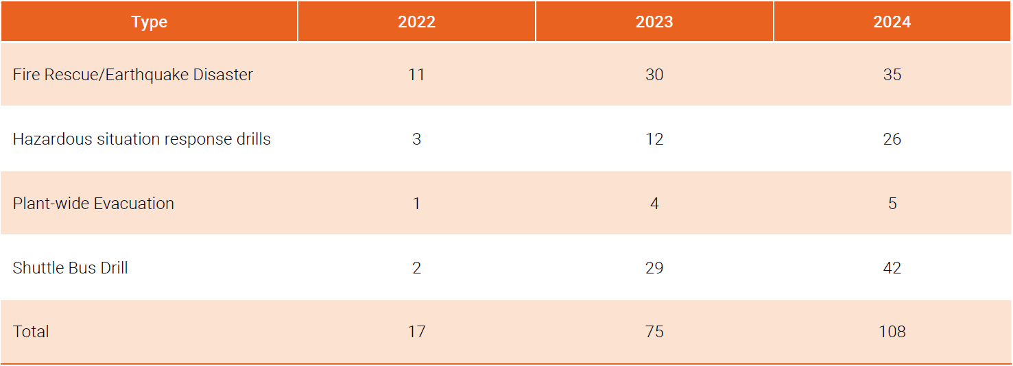 In 2024, the Company conducted 108 emergency response drills. Statistics of drill types and sessions from 2022 to 2024 are as follows: