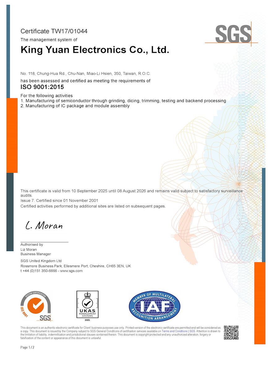選擇了京元電子, 您的產品將會是由一家能符合半導體業界最嚴格品質標準的公司處理, 因為我們不僅具有 ISO 9001、ISO 14001、OHSAS 18001、IATF 16949 等國際認證,同時也取得了Sony綠色夥伴 (Green Partner) 的認證。