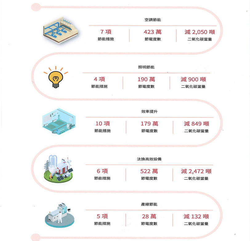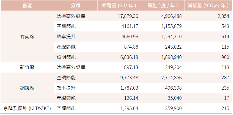 為了提高本公司能源使用效率,京元集團以2020 年為基準年,為將節能觀念內化至組織內所有能源使用單位,公司內部將節能目標由往年的節電率1% 提升為1.5%,本公司透過內部能源規劃指引、能源管理標準,於節能規劃設計將耗能設備的效能標準納入做為日後變更的優先選擇,以汰換老舊設備,增強單位能源使用效率,中期目標於2030年累積節電7,500 萬度,截至報告年度已累積節電6,119萬度。本公司於2024年共展開38項節能專案,共可節能45,973.0553GJ,主要之節能策略為汰換高耗能設備為節能設備及提升設備能源使用效率,且為導入低碳製程;在2024年規劃以自動化方式調控機台進入節能模式,於機台待機一定時間時以程式控制將機台加熱器等元件進行關閉,降低機台待機時間非必要運轉元件之耗能。
