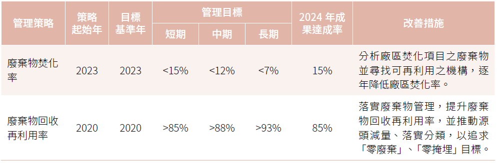 本公司以環境政策為方向,設定各項減廢目標,持續推動綠色環保產品並優先採購,並定期檢視各項目標達成狀況,在近年的努力下,已將廢棄物再利用率從2020年的80.4%提升至85%,持續找尋再利用之機構,並規劃在2025年將廢液及廢鋁箔袋由焚化處理轉換為回收再利用,達到廢棄物資源再利用之目標。