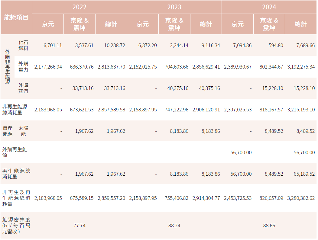 2024年度京元集團能源總消耗量為3,280,382.62十億焦耳(GJ),非再生能源占98.01%、再生能源占1.99%,能源密集度為88.66(GJ/每百萬元營收)。本公司能源消耗以外購電力為大宗,占總能耗97.31%,故於後續節能規劃上,將以降低電力及擴大再生能源使用為主要目標。2024年本公司能源密集度較2022年及2023年增加,主要為各廠區持續擴增產線; 並因應產能需求提升機台稼動率,導致相較於2023年的用電量大幅上升,故2024年本公司能源密集度較高。