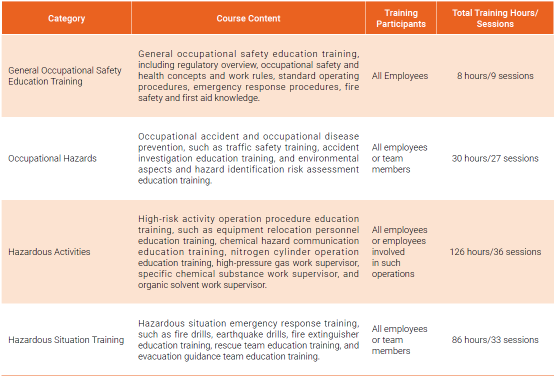 Each year, King Yuan Group plans safety and health training programs, providing professional training to enhance employees' safety knowledge and reduce accident rates. All employees receive at least one hour of safety and health education training every year, and the OSH Committee regularly reviews training outcomes.