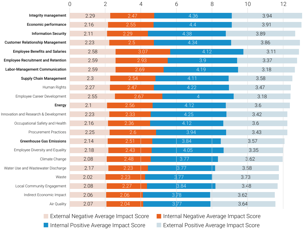 In 2024, a total of 695 questionnaires were conducted. After excluding invalid responses, 540 valid questionnaires remained, comprising 58 internal and 482 external responses. After calculating the positive and negative impact scores of each issue for internal and external stakeholders, we ranked all issues from highest to lowest total impact score. The Sustainable Development Committee set the materiality threshold as "the top one-third of total scores," screening out 8 material issues for this period. Additionally, considering that energy and greenhouse gas emissions are also issues that the Group and the semiconductor industry should strengthen their focus on, these two issues were included in material issue management, resulting in a total of 10 material issues for 2024.