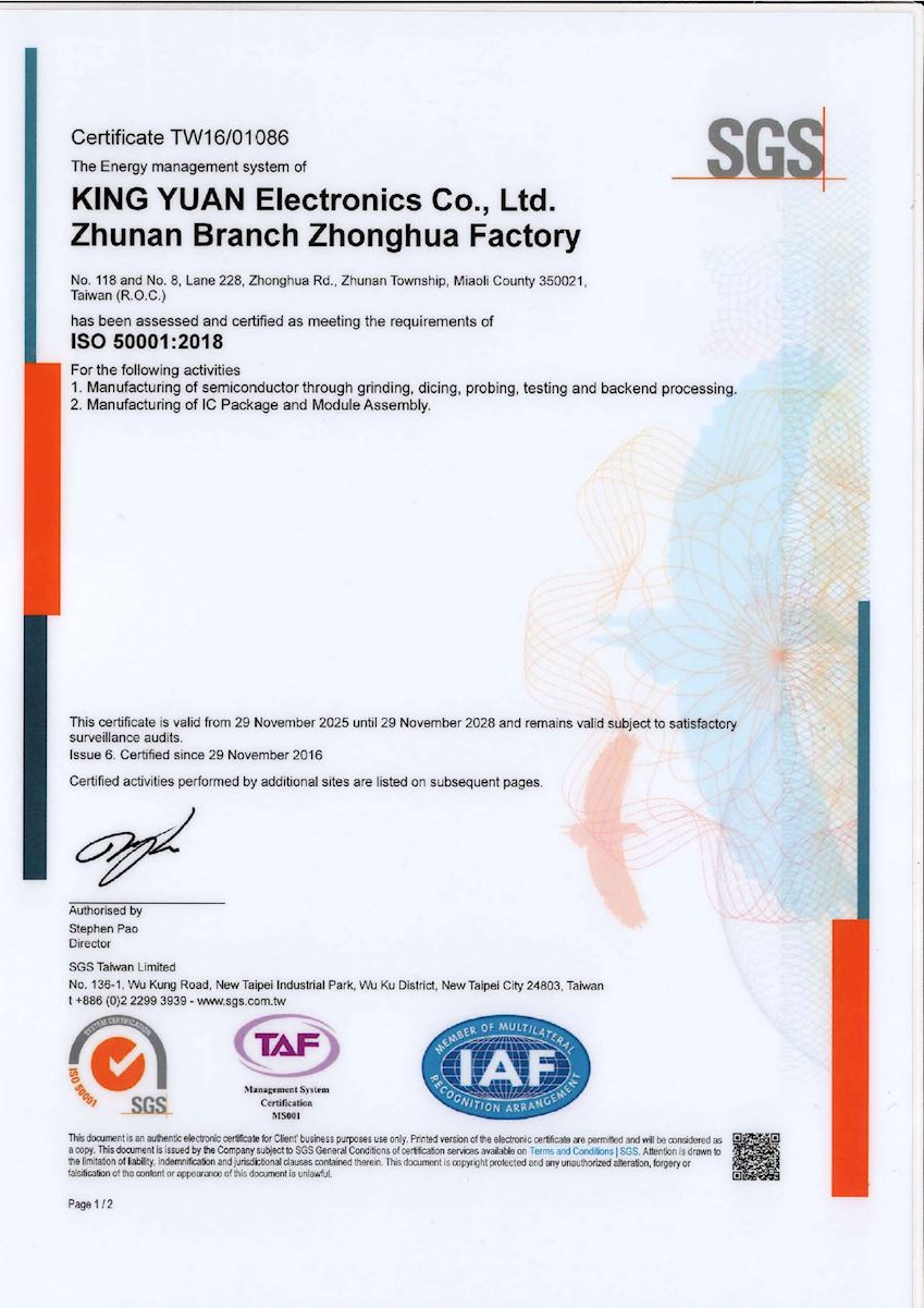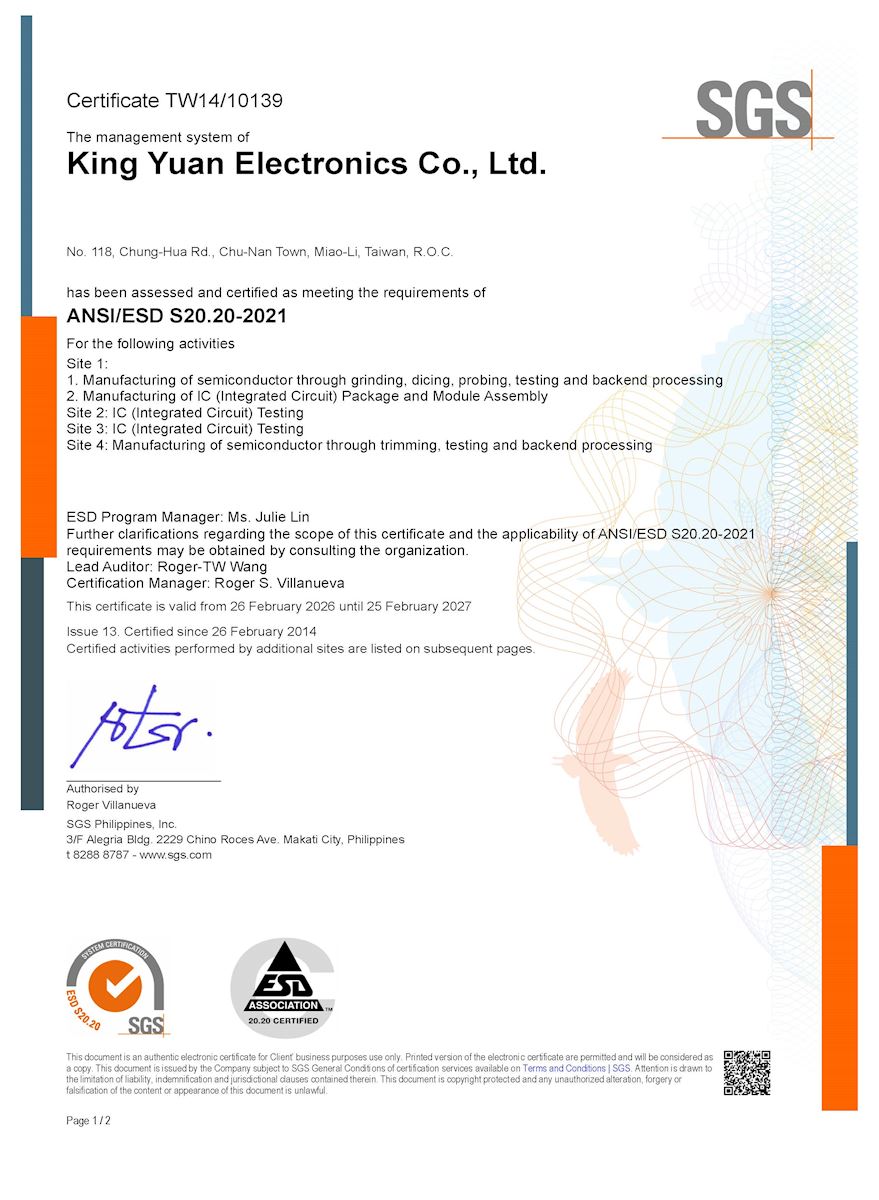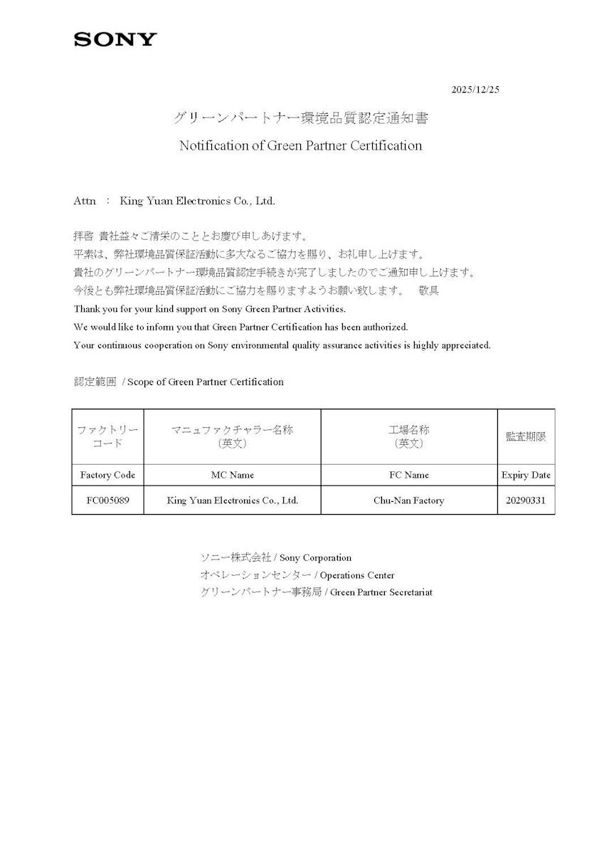 選擇了京元電子, 您的產品將會是由一家能符合半導體業界最嚴格品質標準的公司處理, 因為我們不僅具有 ISO 9001、ISO 14001、OHSAS 18001、IATF 16949 等國際認證,同時也取得了Sony綠色夥伴 (Green Partner) 的認證。