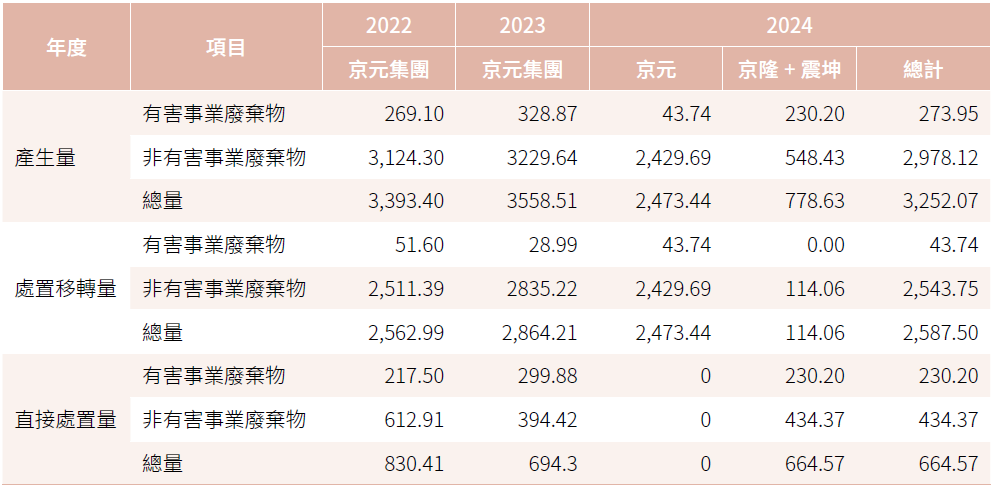 除了致力從源頭減少廢棄物量外,為提升既有廢棄物資源價值,京元集團在符合當地法規及現有可行的技術下,盡量採用再生利用、再使用等回收方式處理,讓廢棄物資源能夠達到最有效的利用。2024年本公司16%有害事業廢棄物及85.4%非有害事業廢棄物係採用回收方式處理,佔年度廢棄物總79.6%。