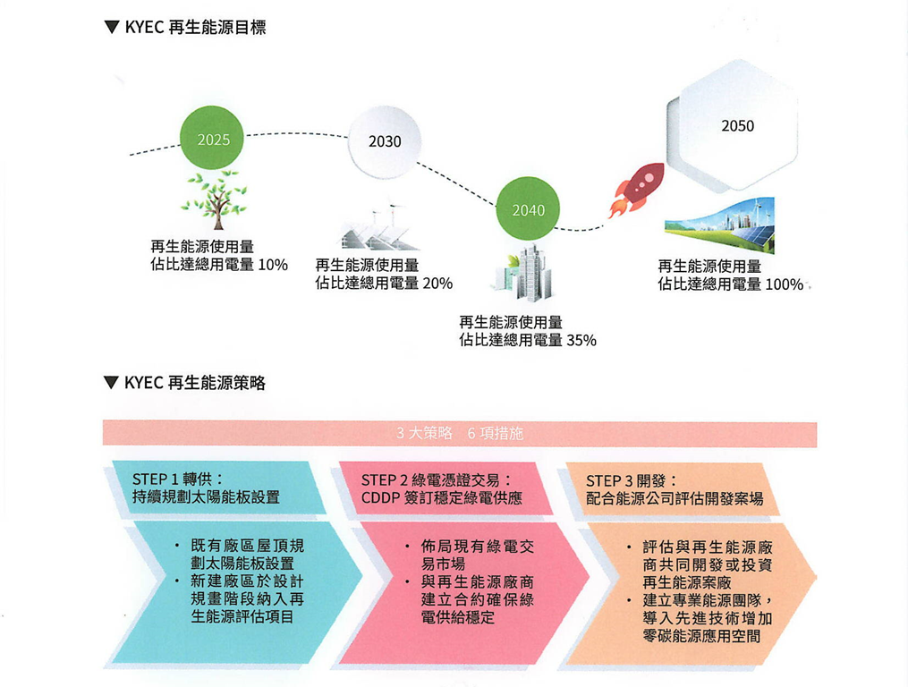 再生能源的行動規劃,2022年8月京隆(KLT)及2024年1月銅鑼廠區已分別完成太陽能發電系統的建置並發電(僅京隆(KLT)為自發自用);竹南廠亦規畫於2026年將完成太陽能光電設施的建置。此外京元(KYEC)透過外購之再生能源轉供,2024年已使用1,575萬度之再生能源;佔京元(KYEC)總用電量2.37%,目標在2025年時達總用電量10%;2030年時達總用電量20%;2040年時達總用電量35%;2050年時達總用電量100%,本公司以持續精進綠色生產績效為重要之關鍵行動。