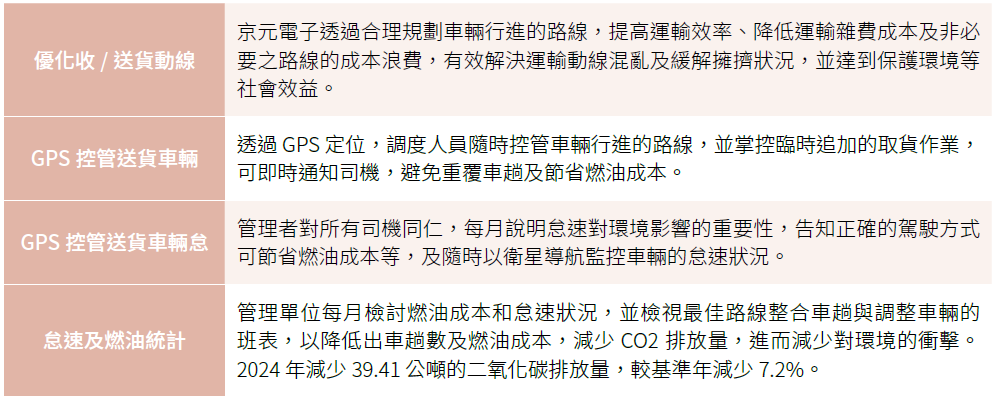 減排行動E:持續進行綠色運輸減碳,2024年起與廢棄物清除商合作; 透過廢棄物壓縮減容處理可減少清運車趟,預估未來每年可減少6,000噸範疇三排放
